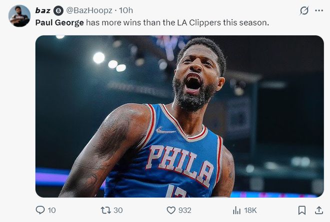 费城球迷还扎心快船,本赛季乔治的胜场数比快船的胜场数要多!快船目前只有6胜,而费城已经14胜。